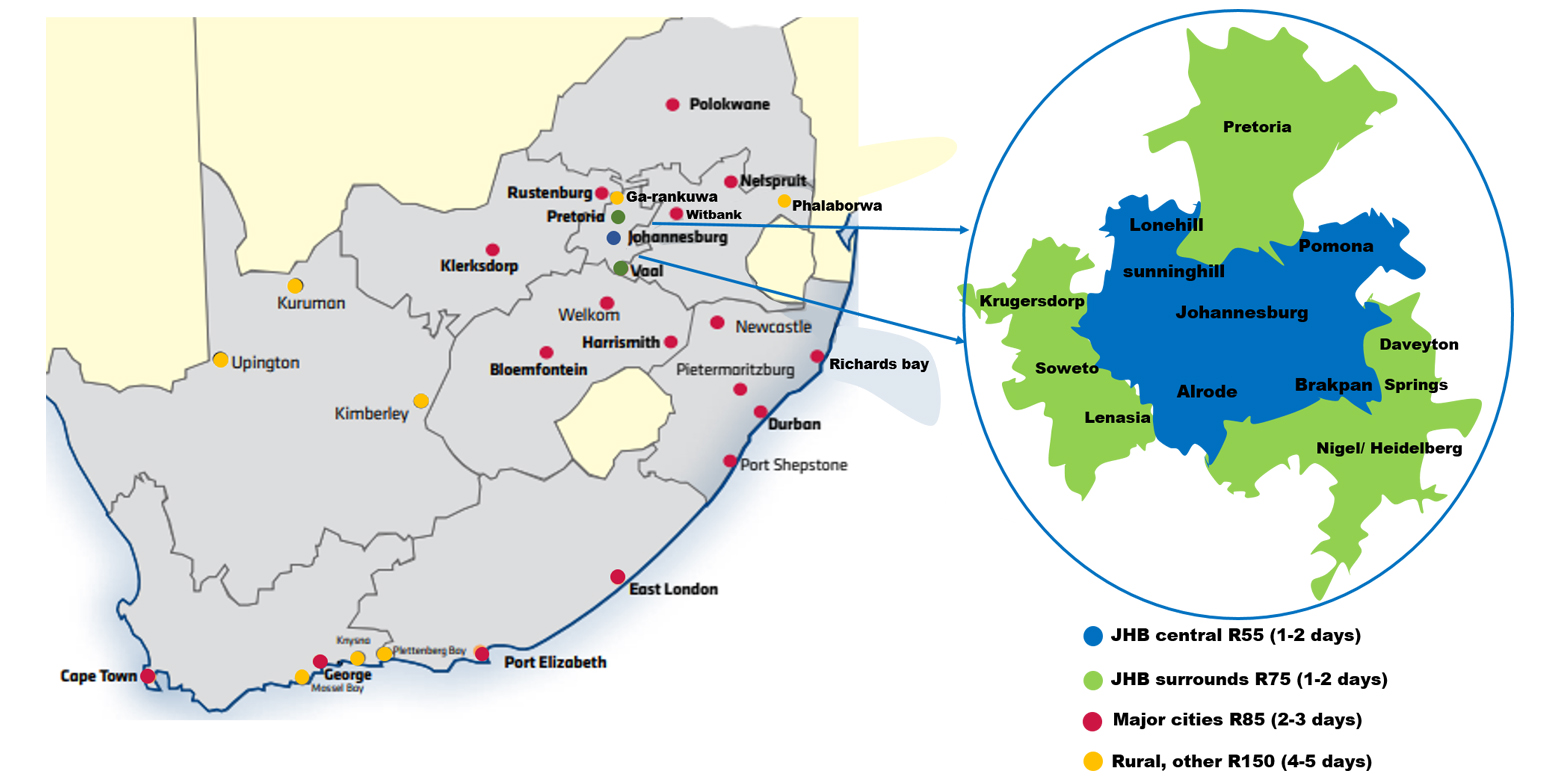4. Major cities outside of Johannesburg (regional)- Bloemfontein; Cape Town; Durban; Port Elizabeth; East London;George: R85 (2-3 days)