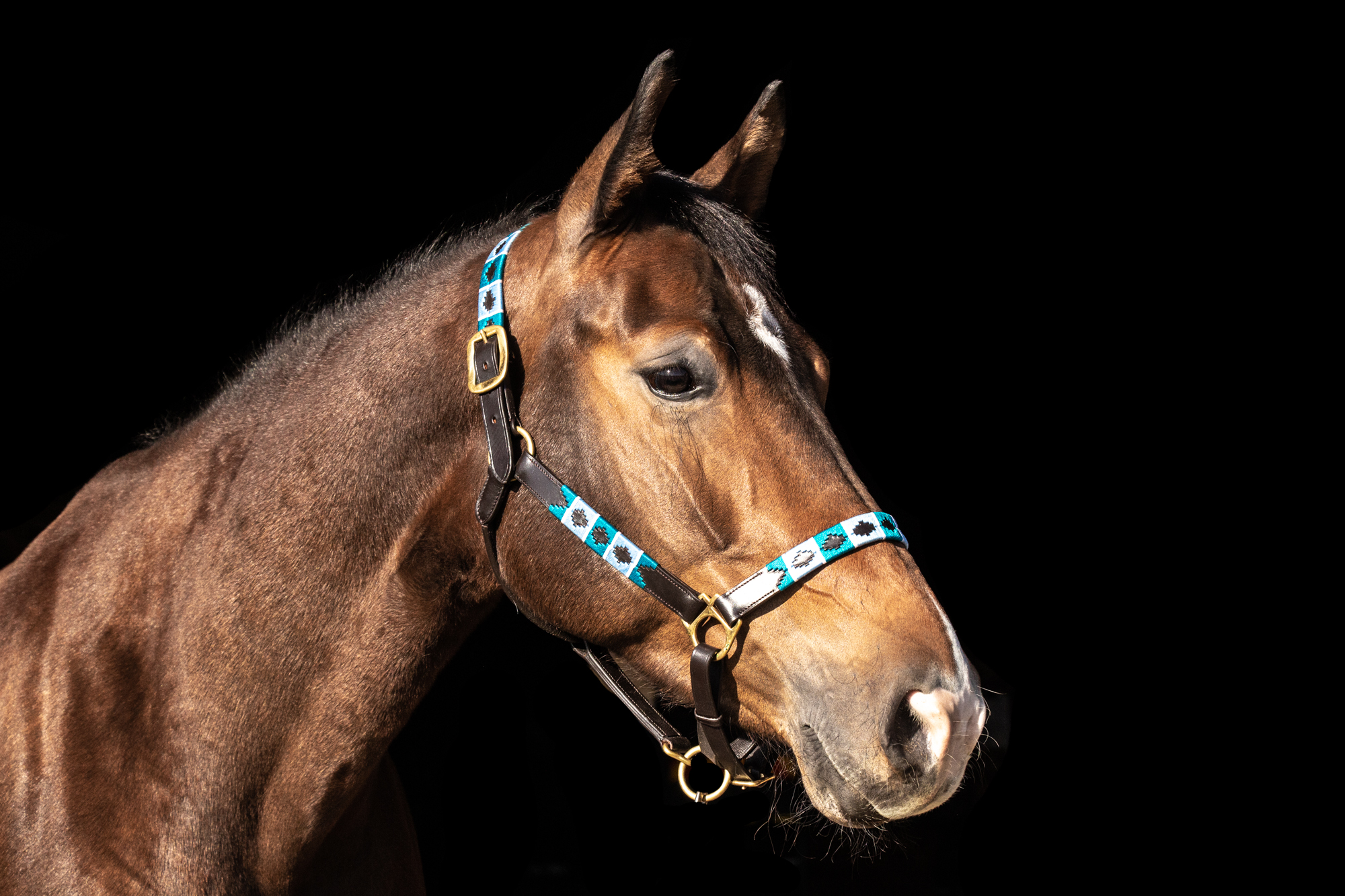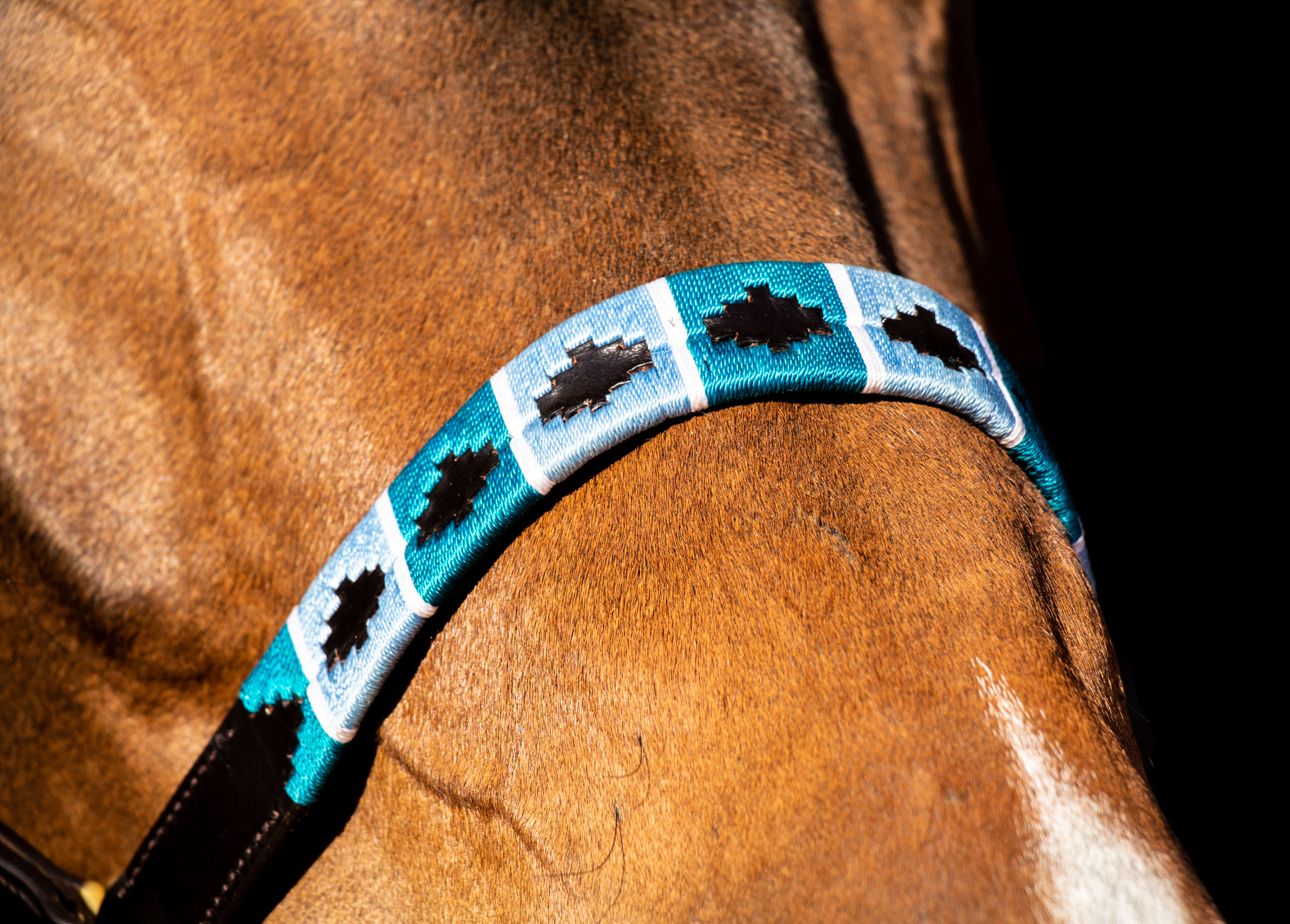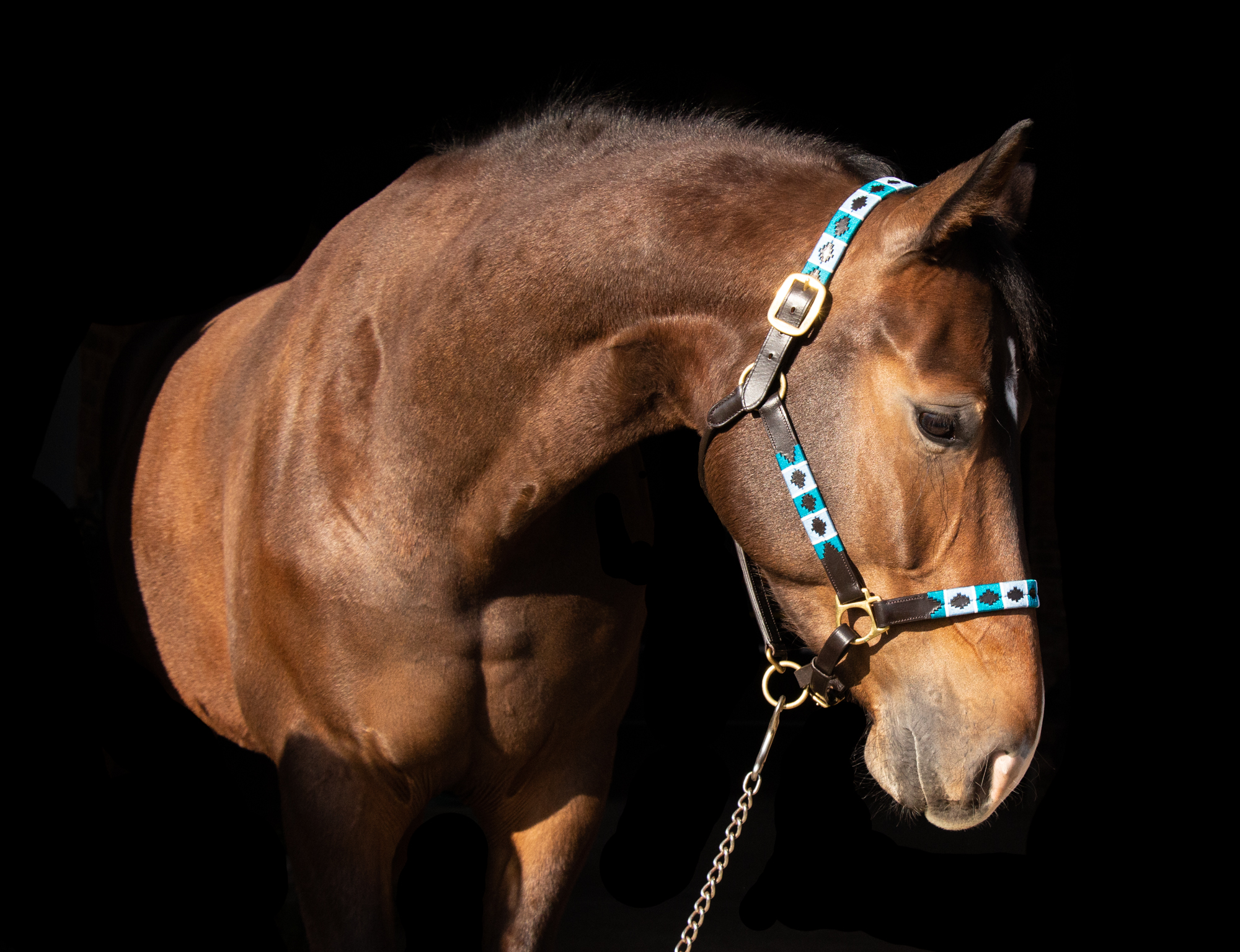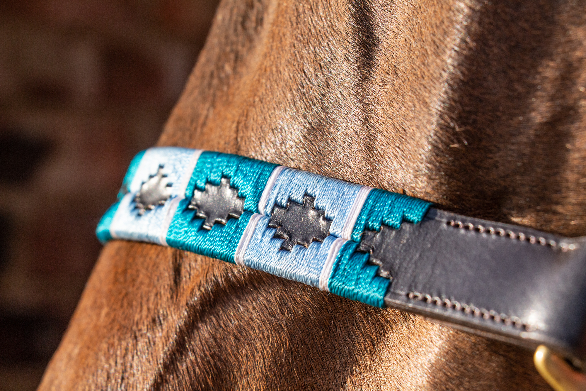 The Turquoise and Blue threaded Polo halter is beautiful on any horse, but looks exceptional on dark bay / black and grey horses!